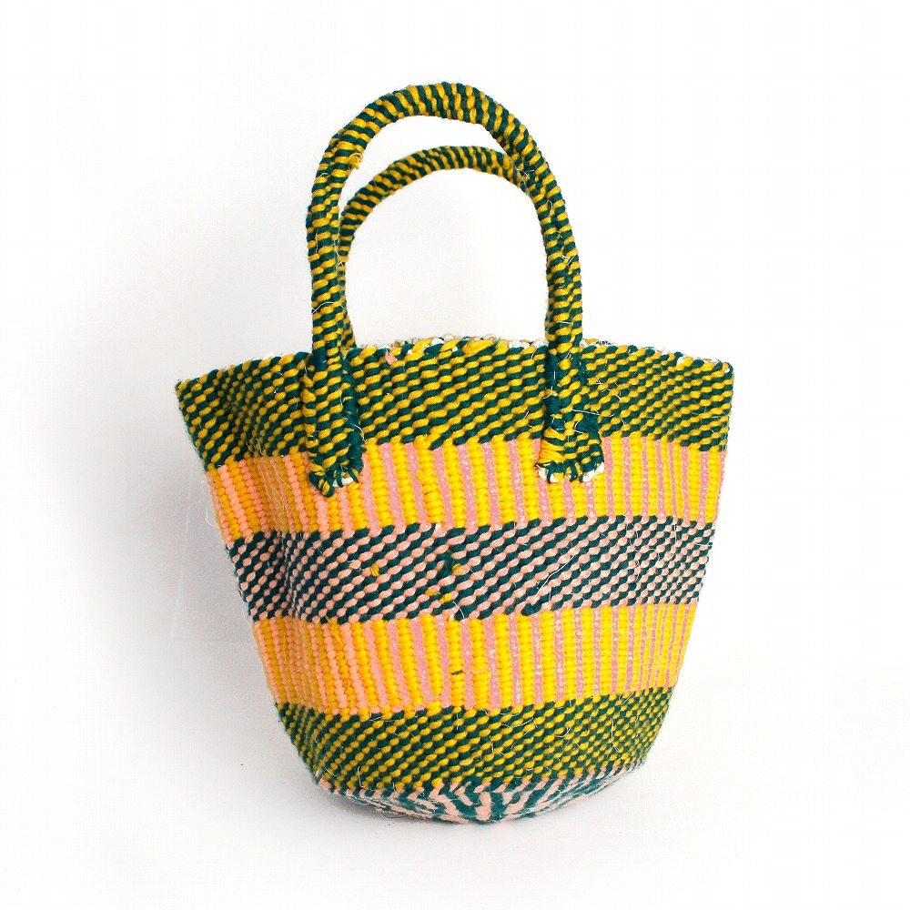 サイザル麻を芯にして、カラフルなスクールセーターのリサイクル毛糸を編んだアップサイクルバッグ。優しい手触りと色合いがとても使いやすいです。スマホや財布など意外と色々入り、少しお出かけするのにちょうどよいサイズ、オールシーズン活躍するカゴバッグです。アイディアを加えることで付加価値の高いモノに生まれ変わらせるサスティナブルな試み。世界に一つしかない価値ある「アップサイクルバッグ」いかがでしょうか?