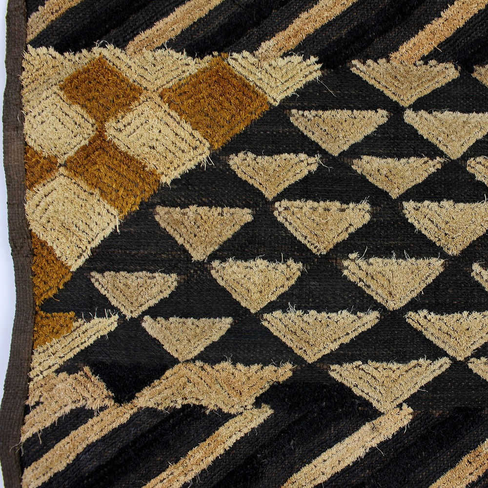こちらは草ビロードとも呼ばれるショワの人々が作るクバ布で、平織のラフィアの生地に2種類の刺繍の技法を組みああせて作られています。規則性がありながらも自由さがうかがえる模様には、人を惹きつけてやまない魅力にあふれています。こちらの商品は一点物です。