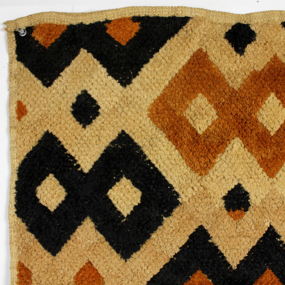 こちらは草ビロードとも呼ばれるショワの人々が作るクバ布で、平織のラフィアの生地に2種類の刺繍の技法を組みああせて作られています。規則性がありながらも自由さがうかがえる模様には、人を惹きつけてやまない魅力にあふれています。こちらの商品は一点物です。