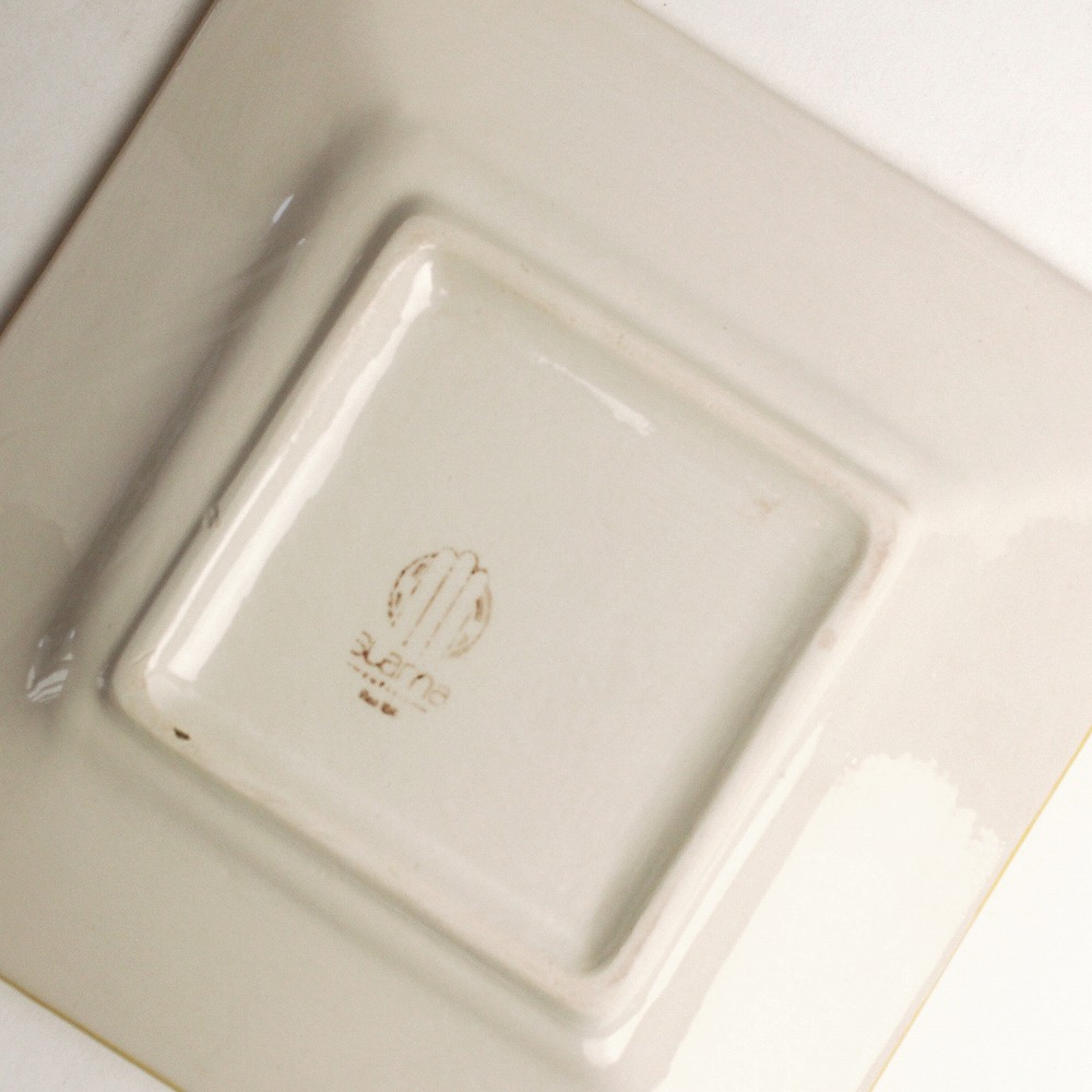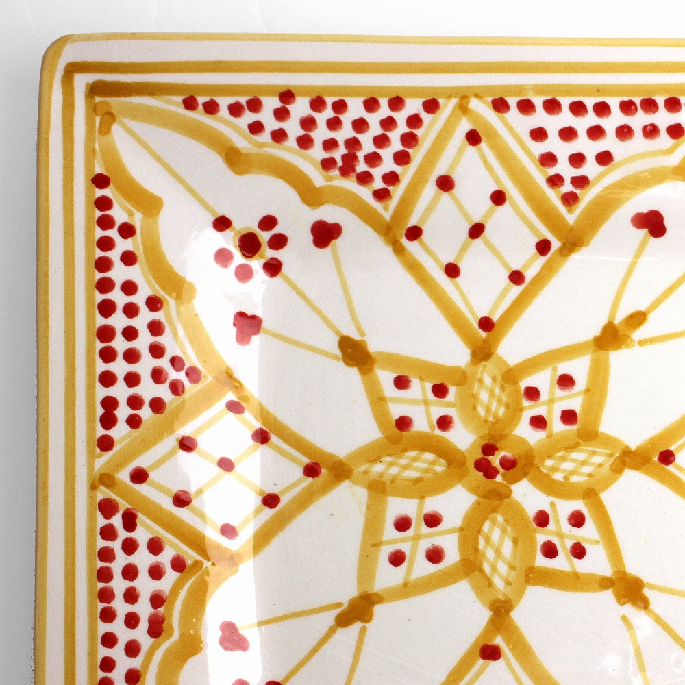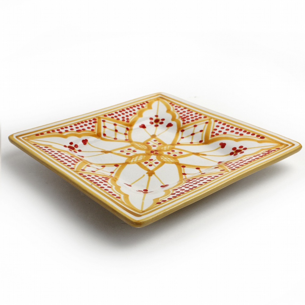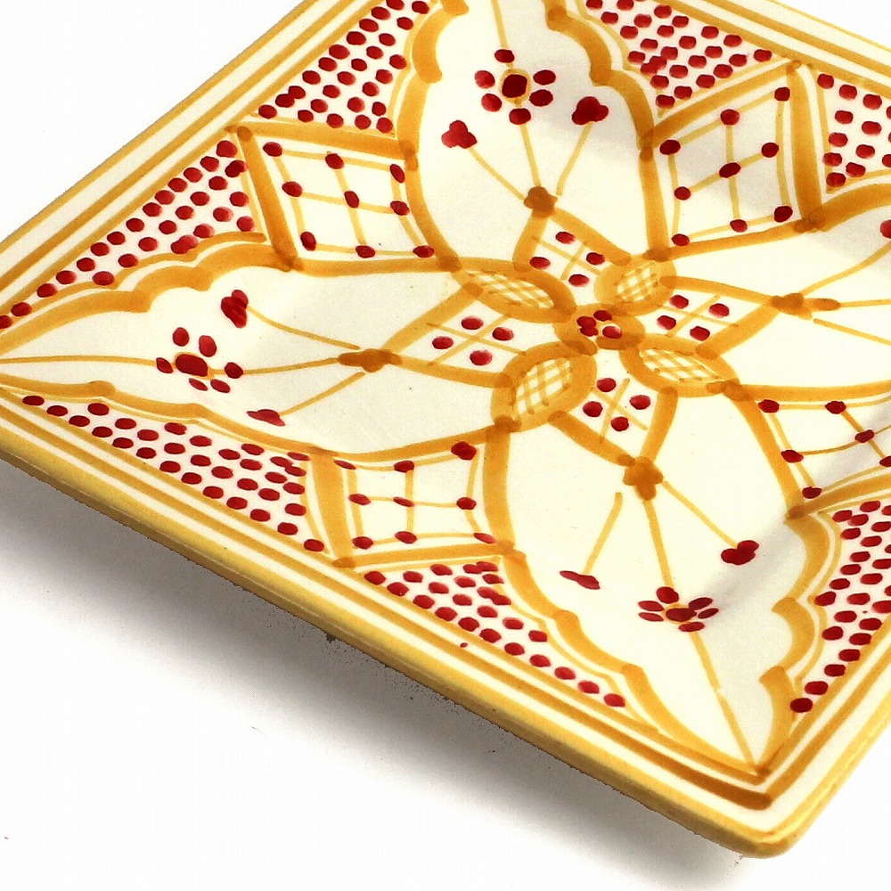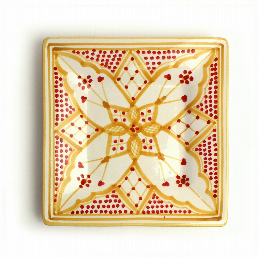 チュニジアSLAMA製の手描き四角皿です。鮮やかなアラベスク模様に描かれたエキゾチックな柄のお皿です。チュニジアは地中海沿岸という土地柄から、ヨーロッパとイスラム文化が融合した伝統工芸が盛んで、北アフリカ有数の陶器の生産地です。現地の市場に行くと、美しい工芸品で溢れています。成形や絵付け技術は受け継がれ、今もなお手作りされています。*こちらの商品は、食品検査を通していますので、食器としてご使用になれます。