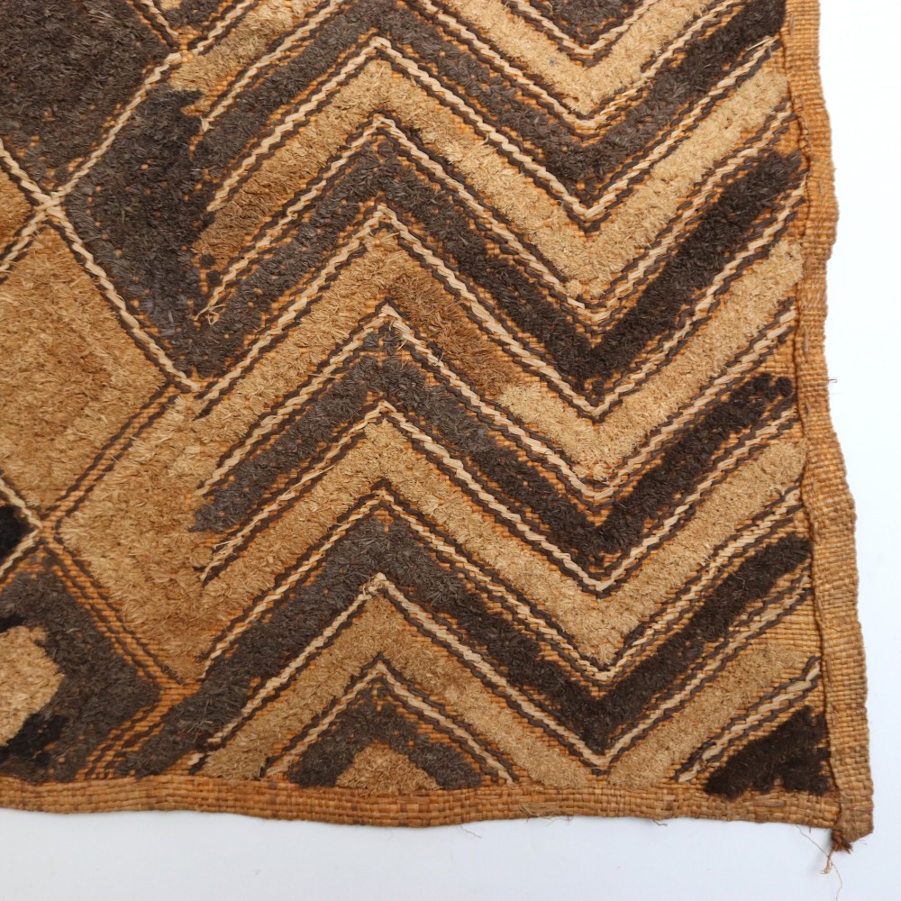 こちらは草ビロードとも呼ばれるショワの人々が作るクバ布で、平織のラフィアの生地に2種類の刺繍の技法を組みああせて作られています。規則性がありながらも自由さがうかがえる模様には、人を惹きつけてやまない魅力にあふれています。こちらの商品は一点物です。