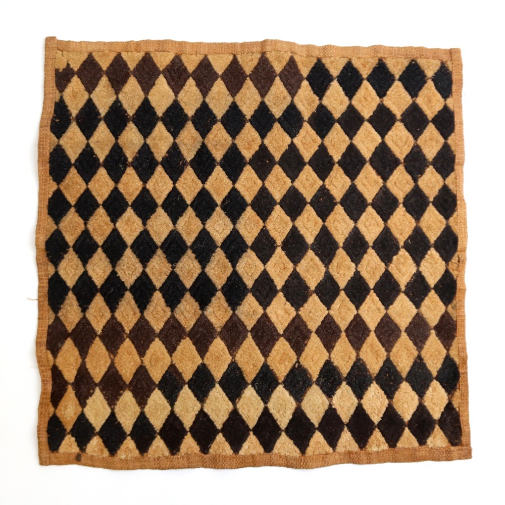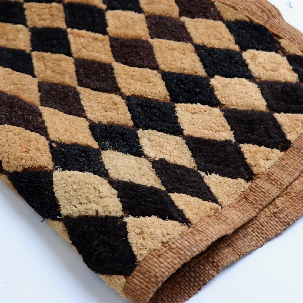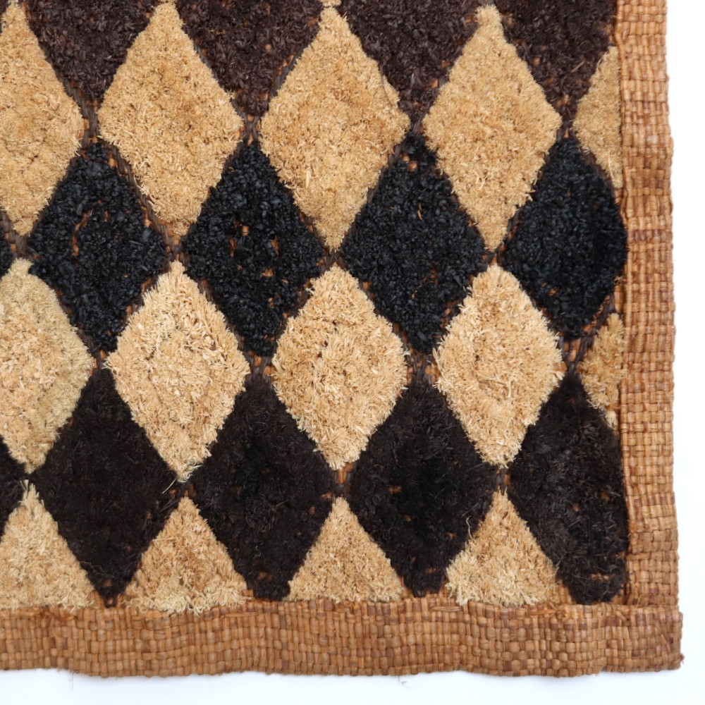 こちらは草ビロードとも呼ばれるショワの人々が作るクバ布で、平織のラフィアの生地に2種類の刺繍の技法を組みああせて作られています。規則性がありながらも自由さがうかがえる模様には、人を惹きつけてやまない魅力にあふれています。こちらの商品は一点物です。
