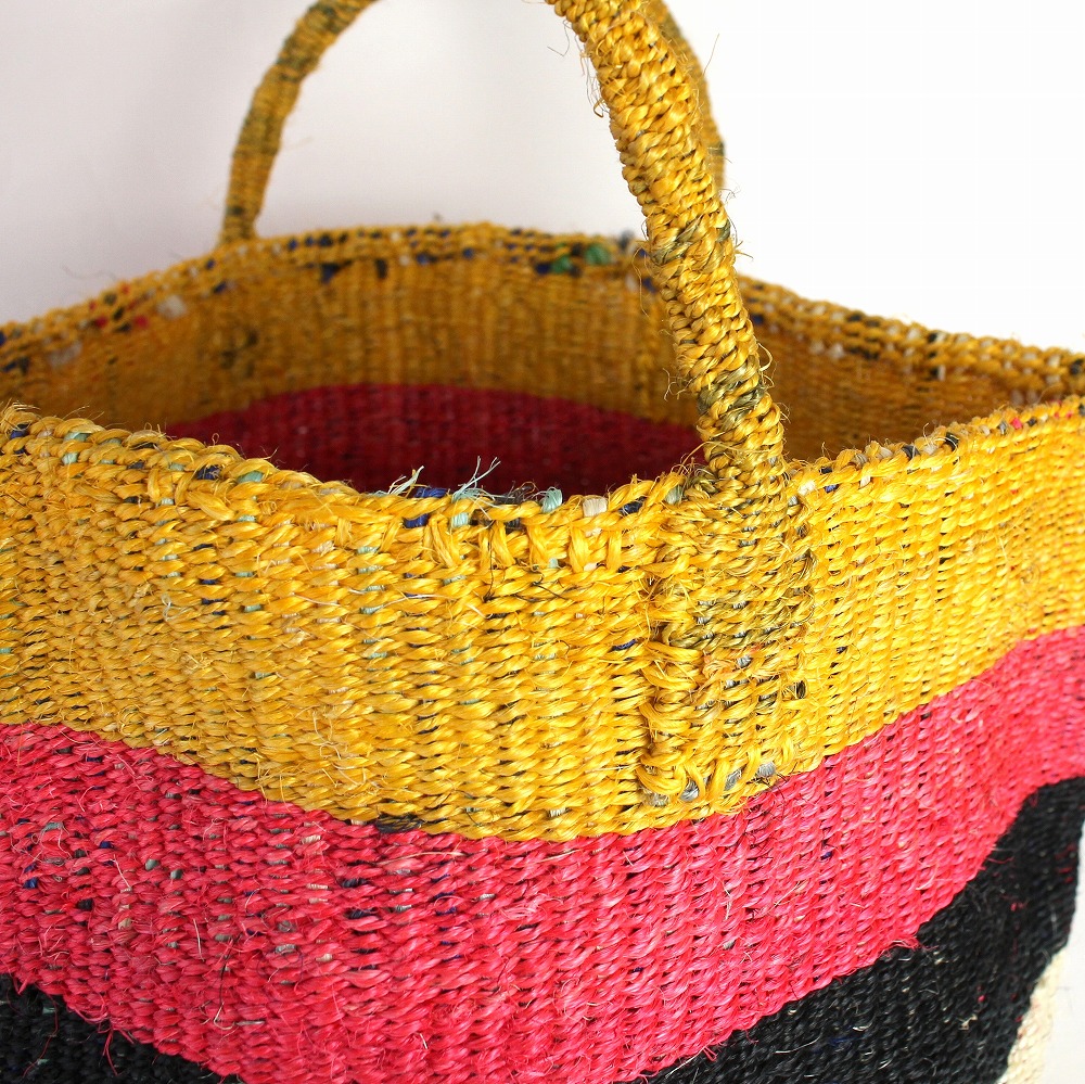 サイザルとはリュウゼツランの一種で、その繊維は歴史的に広く使われていた繊維である麻にちなんでサイザル麻と呼ばれています。ケニアのキクユ人やカンバ人の伝統技術により サイザルで編んだバスケット(=キオンド)は穀物の運搬や保存にケニアでは使われていました。かごを編む技術は母から娘へと受け継がれ、ケニアの小さな農村の女性を中心にひとつひとつ手作りで編み上げています。現在ではサイザルバッグを編むことがケニアの村の重要な現金収入源となり、各家庭の子どもたちの学費となり生活費の足しとなっています。