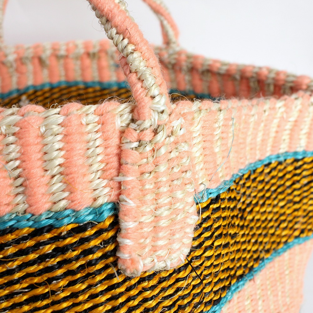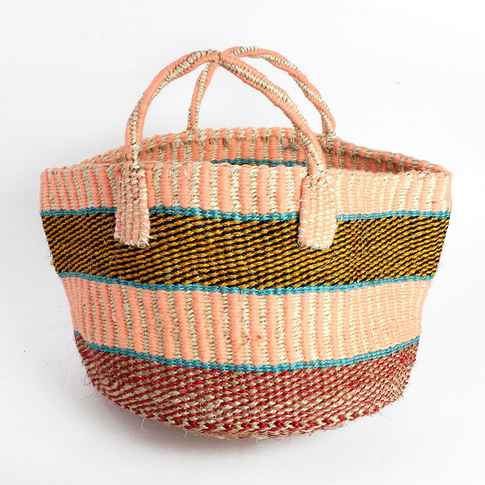 サイザルとはリュウゼツランの一種で、その繊維は歴史的に広く使われていた繊維である麻にちなんでサイザル麻と呼ばれています。ケニアのキクユ人やカンバ人の伝統技術により サイザルで編んだバスケット(=キオンド)は穀物の運搬や保存にケニアでは使われていました。かごを編む技術は母から娘へと受け継がれ、ケニアの小さな農村の女性を中心にひとつひとつ手作りで編み上げています。現在ではサイザルバッグを編むことがケニアの村の重要な現金収入源となり、各家庭の子どもたちの学費となり生活費の足しとなっています。