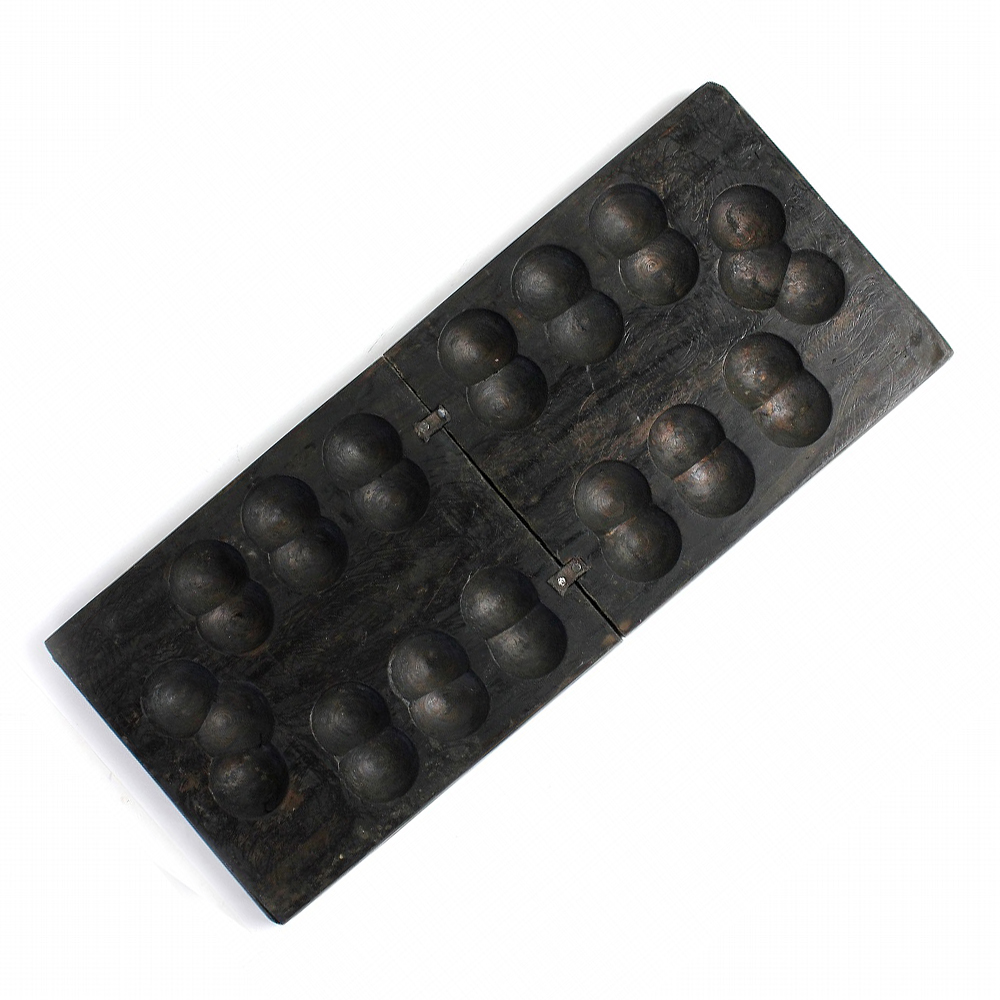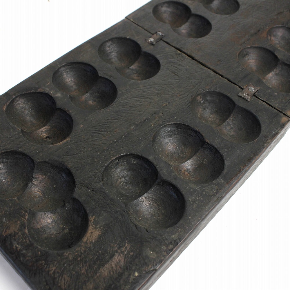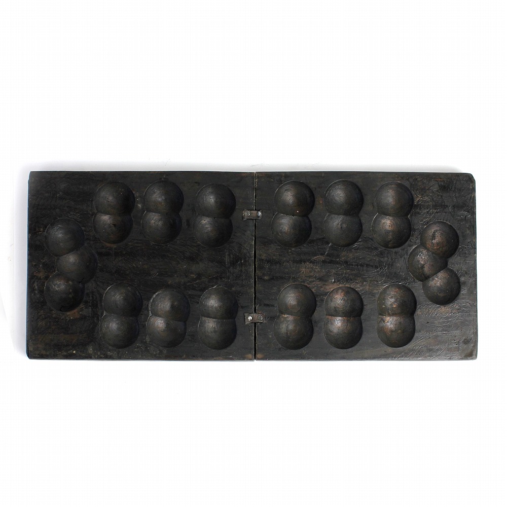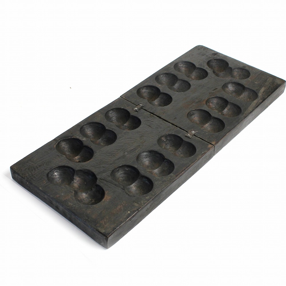 エチオピアから届いたアンティークのマンカラゲームボードです。深い色合い、使い込み感、すべてに味わいがあります。ボードは折り畳み式。マンカラ(mancala)は、アフリカを起源として、豆まきボードゲームです。歴史はかなり古く、紀元前4000年に遡るともいわれています。バックギャモンと並んで世界最古のゲームの一つといわれています。交易や奴隷貿易で世界中に拡がり、今なお世界中で遊ばれるシンプルで奥の深いゲームです。
