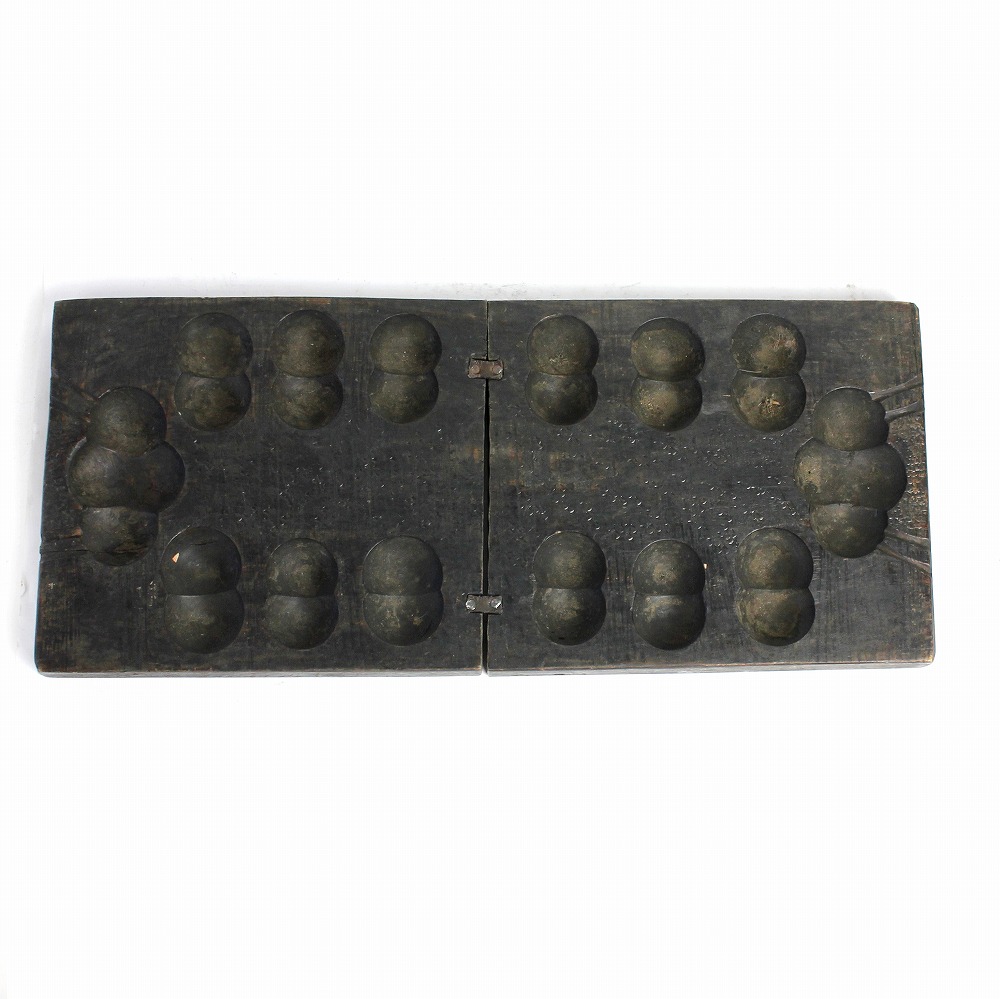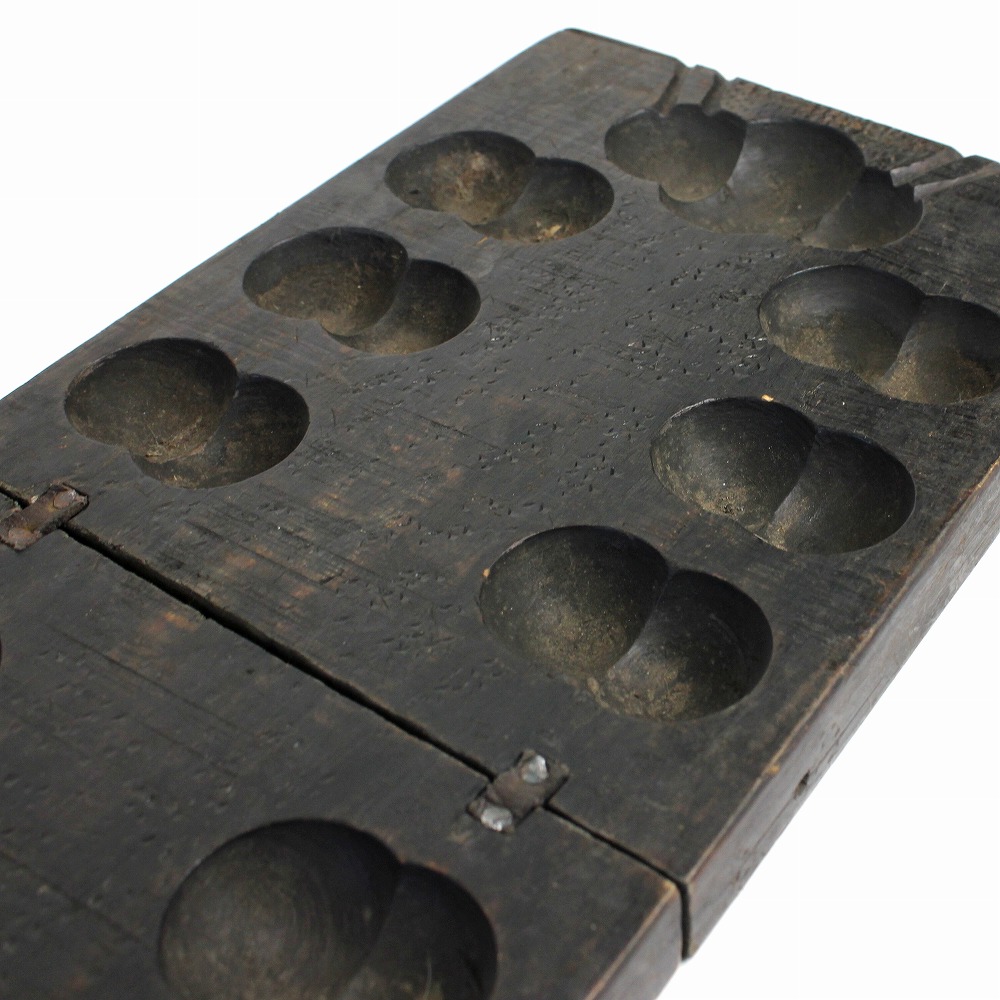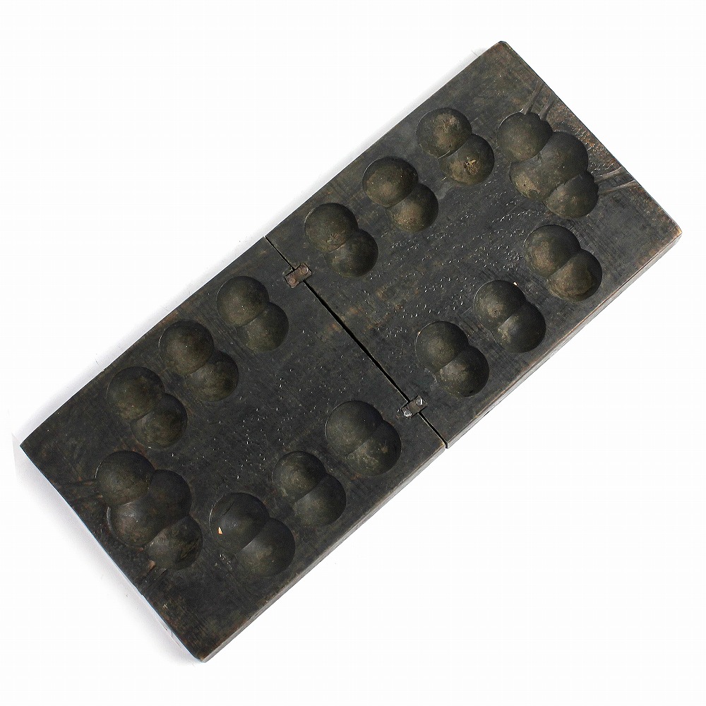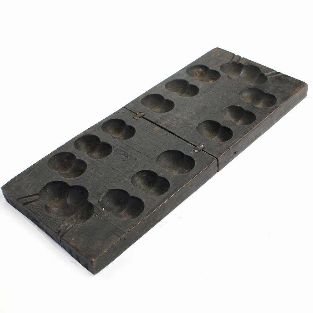 エチオピアから届いたアンティークのマンカラゲームボードです。深い色合い、使い込み感、すべてに味わいがあります。ボードは折り畳み式。マンカラ(mancala)は、アフリカを起源として、豆まきボードゲームです。歴史はかなり古く、紀元前4000年に遡るともいわれています。バックギャモンと並んで世界最古のゲームの一つといわれています。交易や奴隷貿易で世界中に拡がり、今なお世界中で遊ばれるシンプルで奥の深いゲームです。