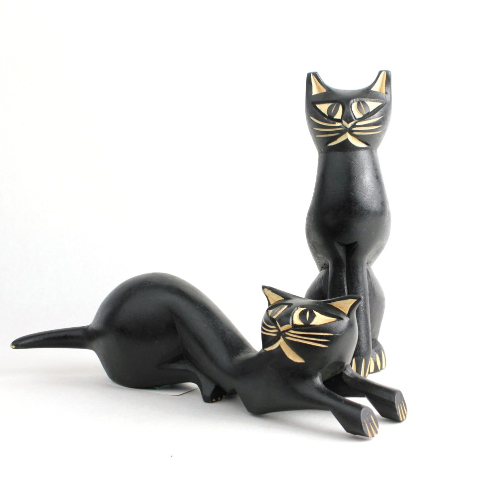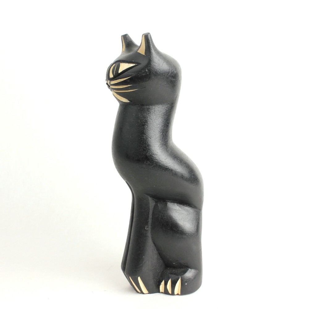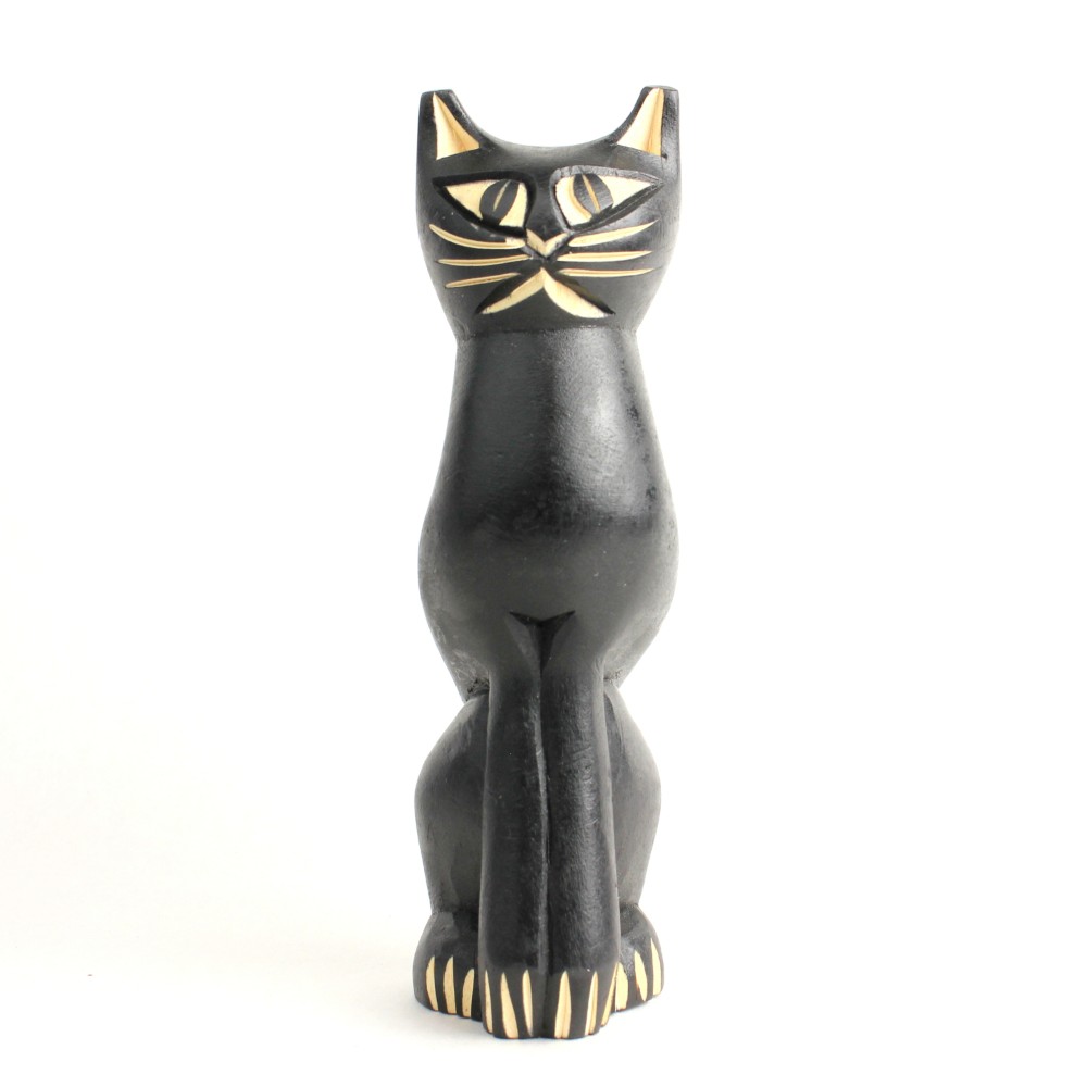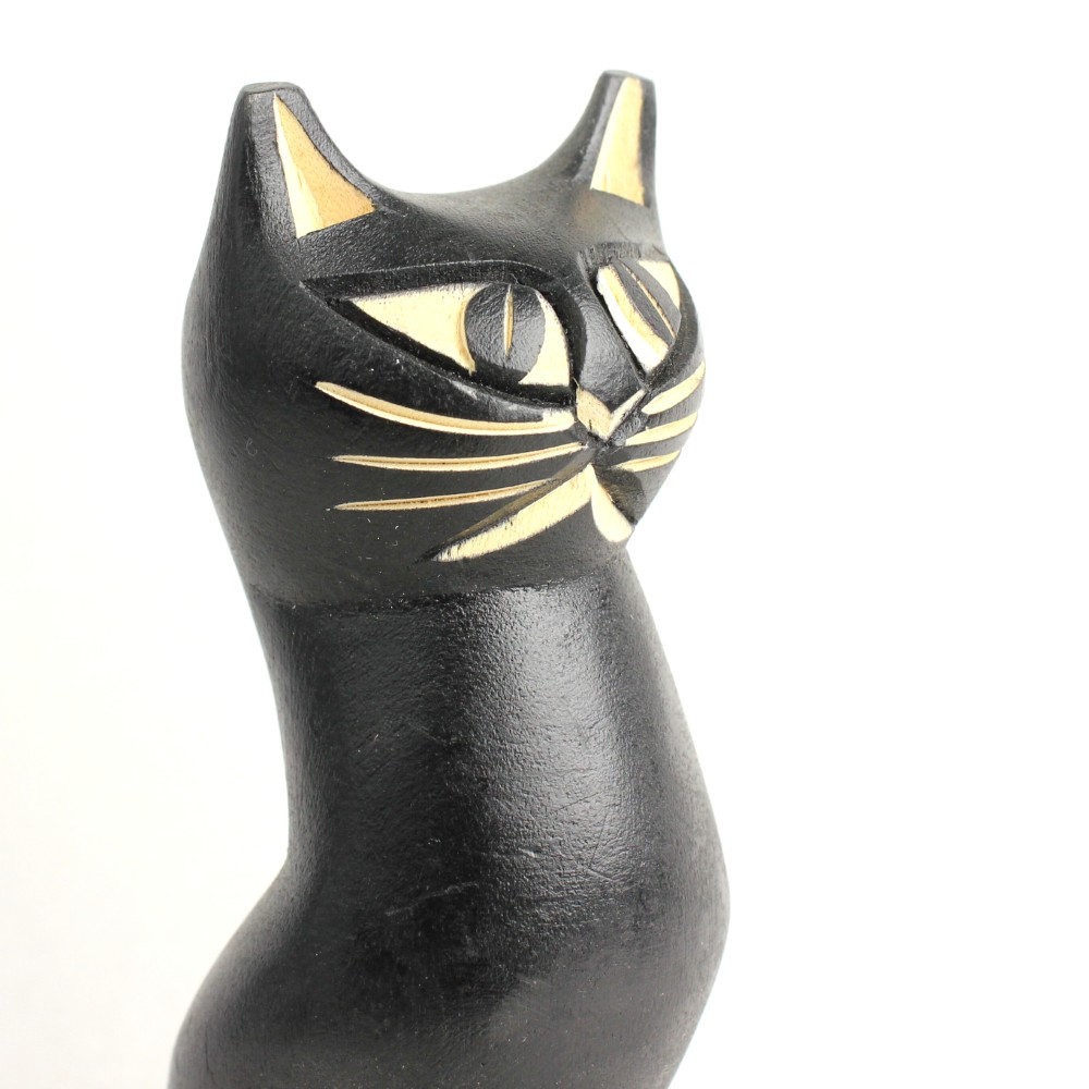 ユーモアと造形美が同居する猫の木製オブジェ。マットな黒の彩色に、削り出した素地のラインが軽やかなアクセントとなり、表情豊かな目元やヒゲ、爪のディテールがユーモラスな存在感を添えています。棚やテーブルの一角に置くだけで視線を引き寄せる、感性あふれる南アフリカの工芸品です。