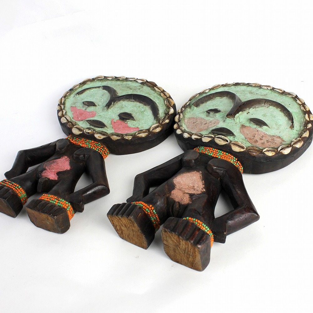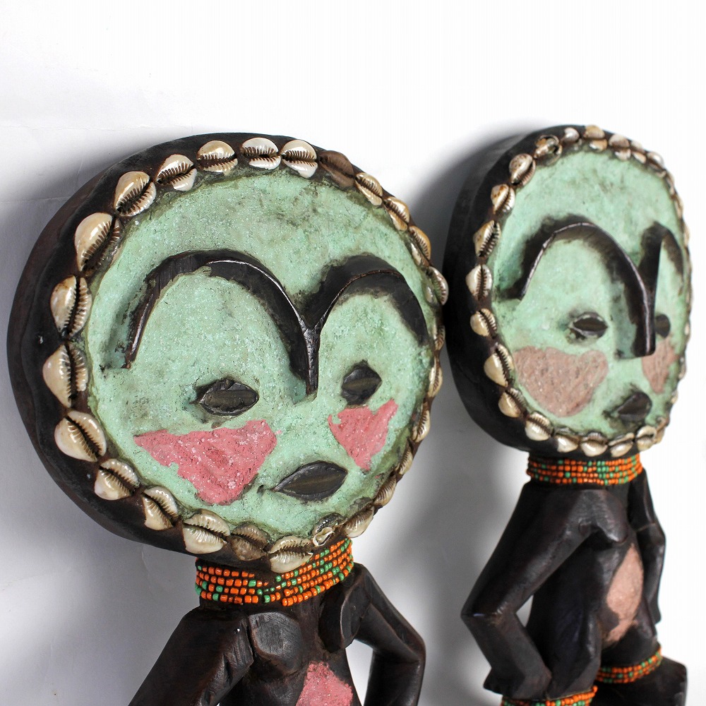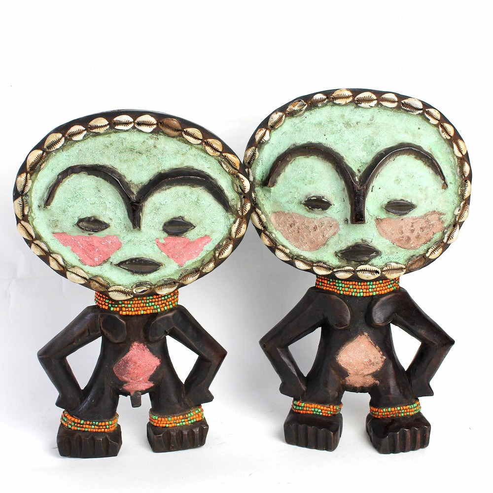 ガーナに住むアシャンティの女性が安産・子宝祈願のためにお守りとして身に着ける、ビーズで装飾された伝統的な木彫り人形です。こちらは男女対タイプ。カラフルな色合いで、お部屋のインテリアにもオススメです。