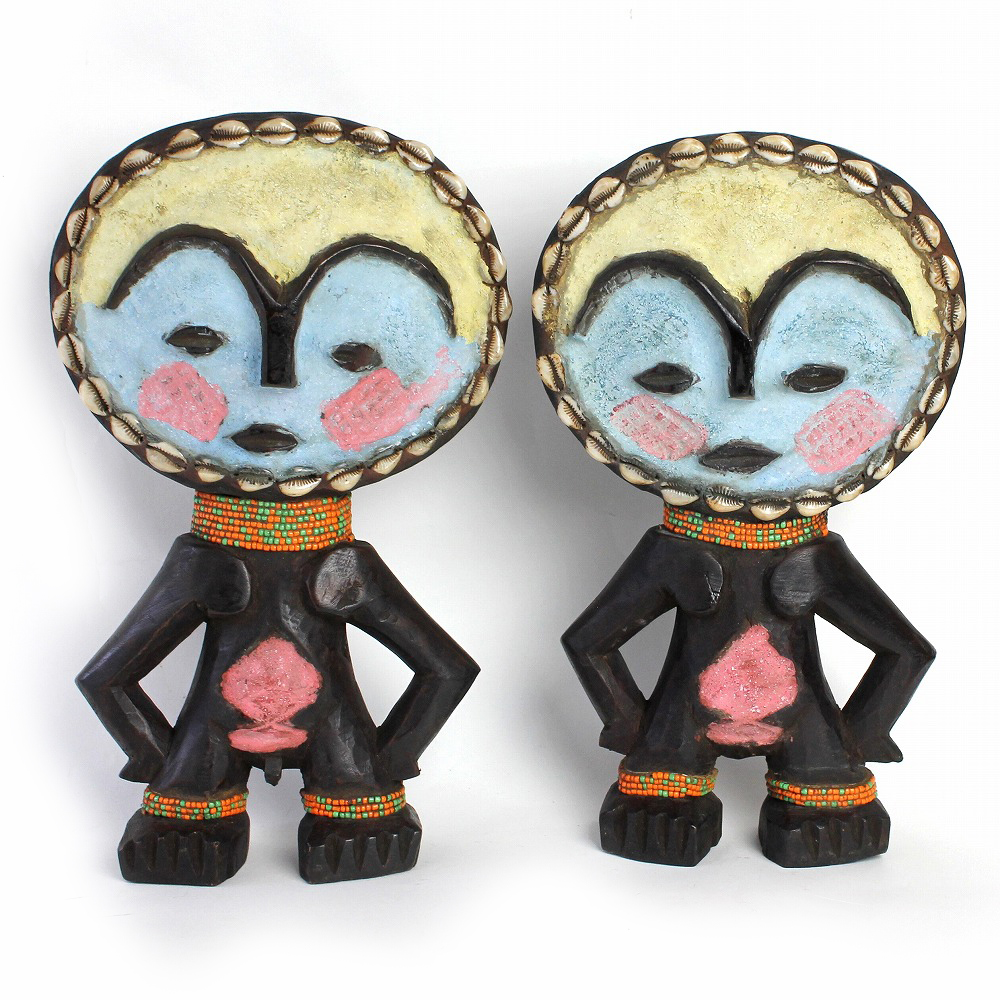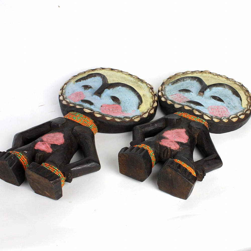 ガーナに住むアシャンティの女性が安産・子宝祈願のためにお守りとして身に着ける、ビーズで装飾された伝統的な木彫り人形です。こちらは男女対タイプ。カラフルな色合いで、お部屋のインテリアにもオススメです。