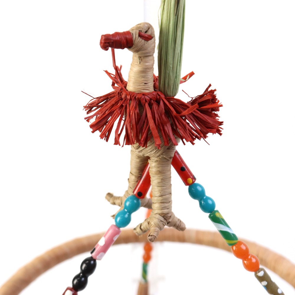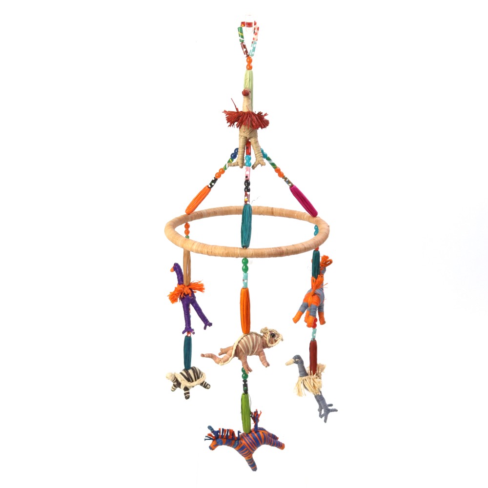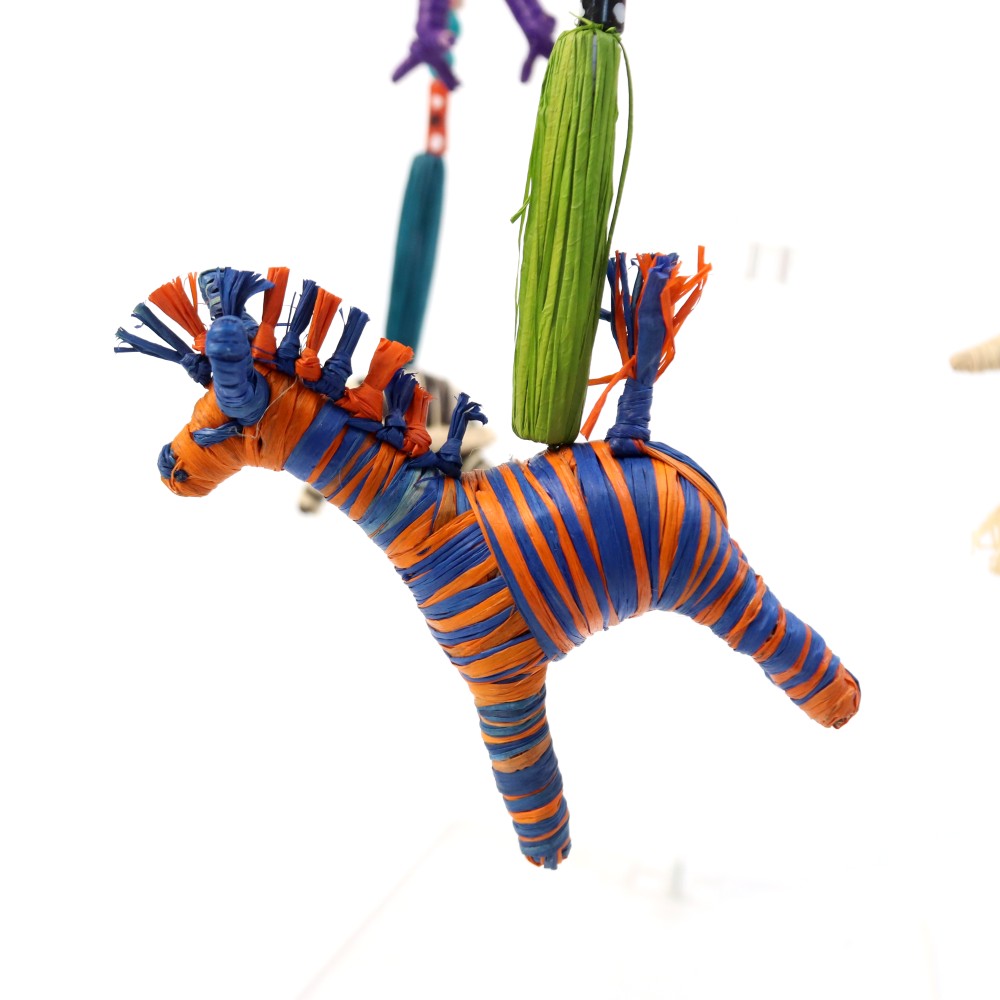 ラフィア椰子で作ったミニサイズの動物のモビール。マダガスカルラフィアならではのカラフルな発色が空間を豊かに彩ります。プレゼントにもおすすめの一品です。