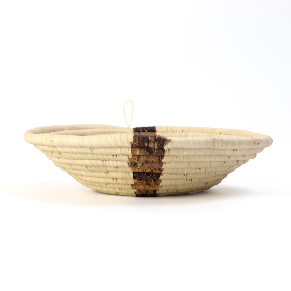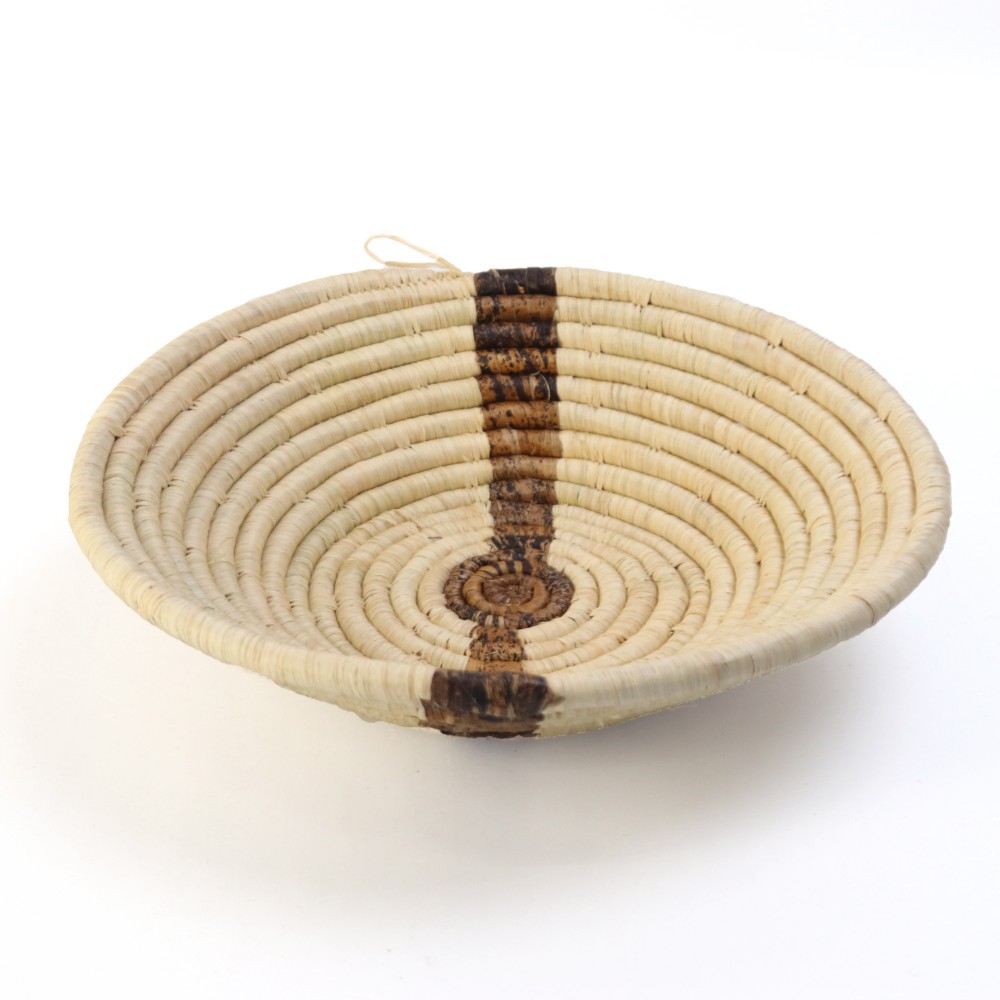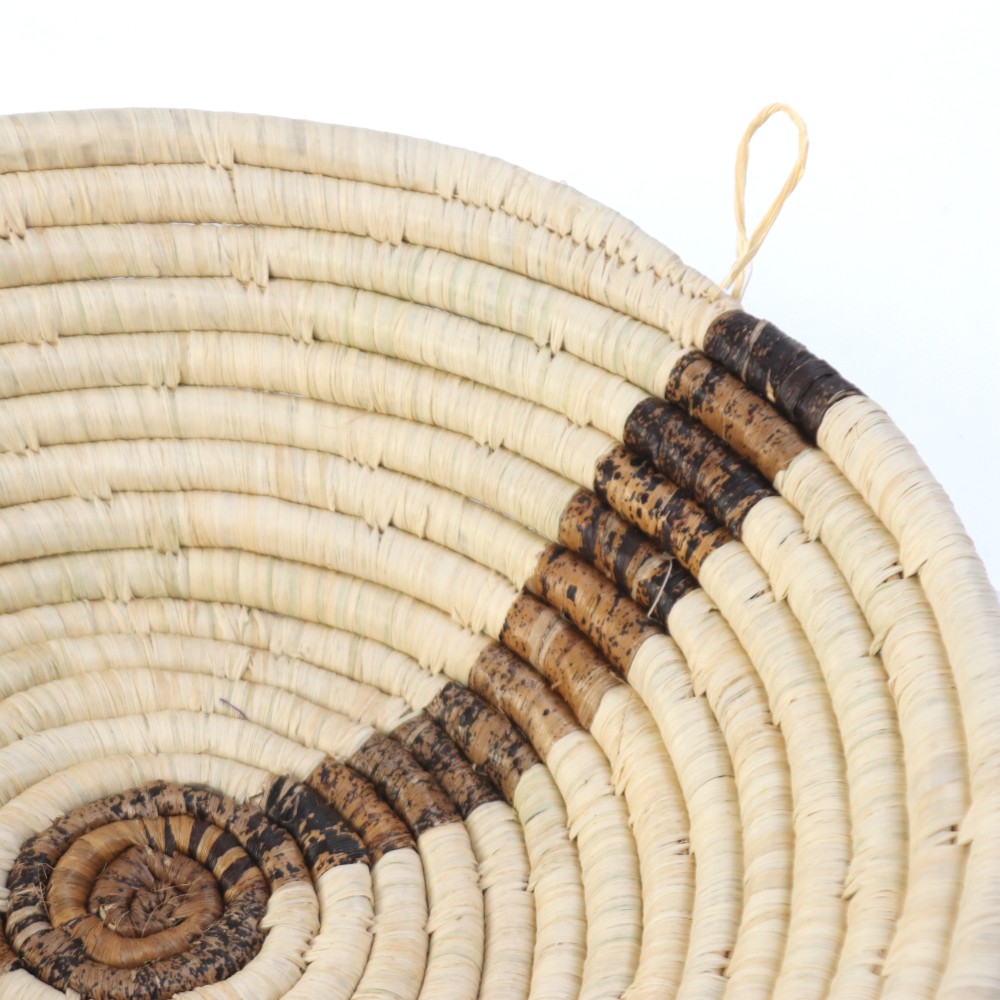 水草にラフィアを巻き付け、バナナの繊維で柄を表現しています。かご編みはウガンダで母から娘へと代々受け継がれている技術。かごは、主に穀物や果物など、食物の運搬などに使用されています。ループ付きなので、ウォールデコバスケットとして壁に掛けるのもおすすめです。