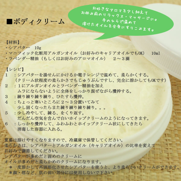 未精製シアバターはまれにアレルギーが起こる場合がありますので、ご使用前にパッチテストをおすすめします。