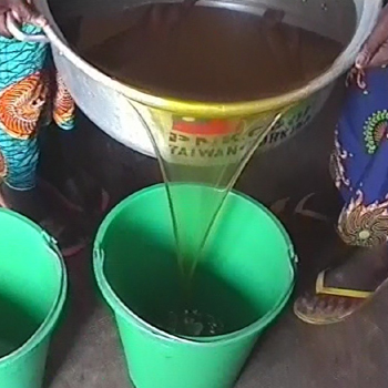 できた油脂を専用の機械でろ過し、不純物を取り除きます。 容器に移してシアバターの完成です。