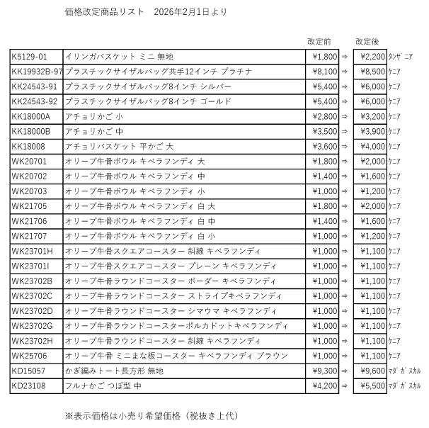 つきましては、2026年2月1日より別紙の通り価格改定を行なうことといたしました。誠に遺憾ではございますが、何卒ご理解を賜りますようお願い申し上げます。